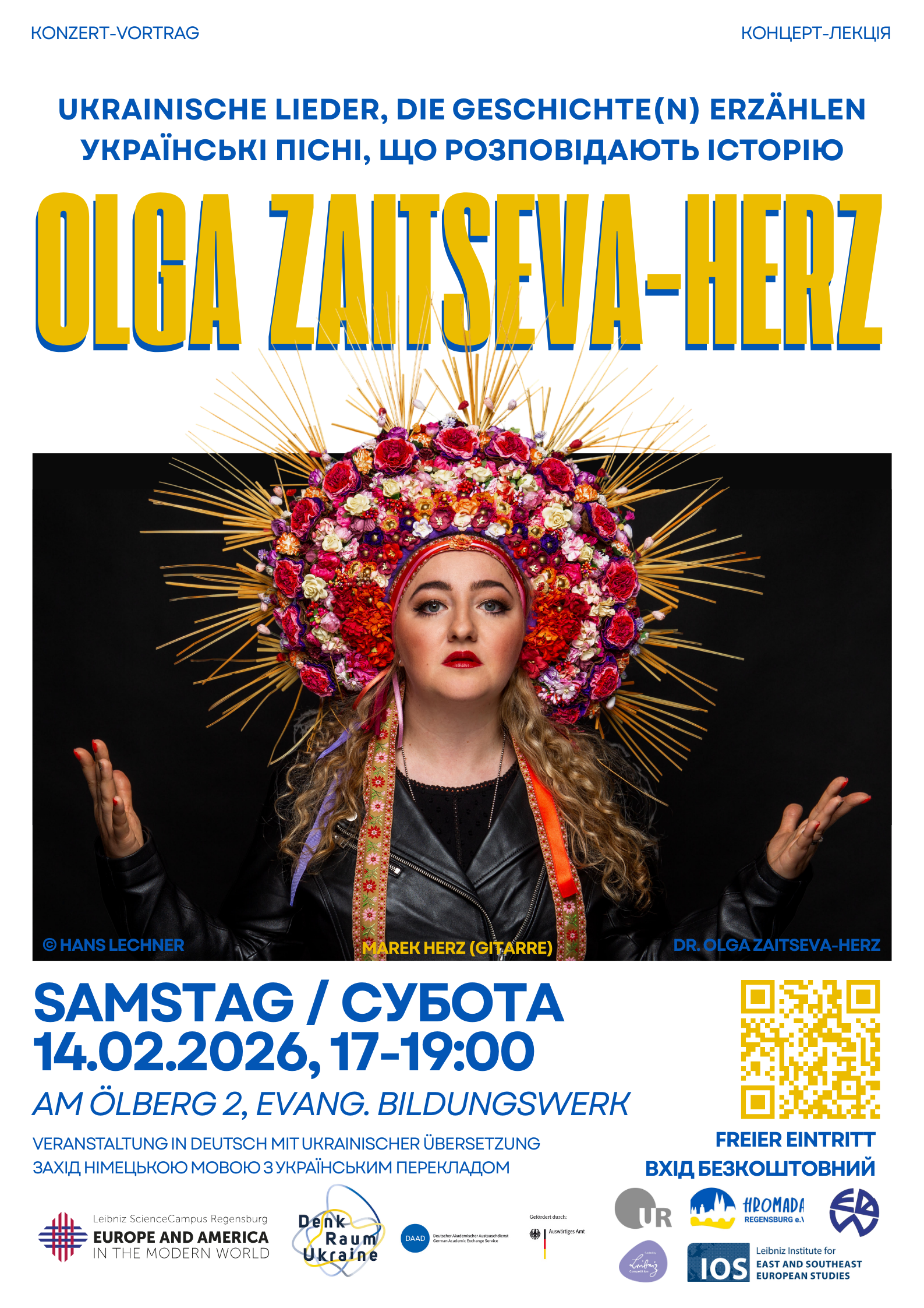 Wir laden alle herzlich zum Konzert-Vortrag von Dr. Olga Zaitseva-Herz und Marek Herz ein. Die Veranstaltung findet am Samstag, den 14. Februar, um 17:00 Uhr im Melanchthon-Saal des Evangelischen Bildungswerks (EBW) statt. Die musikalischen Beiträge werden auf Ukrainisch gesungen. Der Vortragsteil findet auf Deutsch statt und wird ins Ukrainische übersetzt. Die Veranstaltung wird vom Evangelischen Bildungswerk Regensburg und dem Leibniz-WissenschaftsCampus "Europa und Amerika", einem Projekt der Universität Regensburg und des Leibniz-Instituts für Ost- und Südosteuropaforschung, organisiert. Sie findet in Kooperation mit Denkraum Ukraine und dem Ukrainisch-Bayerischer Verein - Hromada Regensburg e.V. statt. | Щиро запрошуємо всіх на концерт та лекцію докторки Ольги Зайцевої-Герц та Марека Герца. Захід відбудеться в суботу, 14 лютого, о 17:00 у залі Меланхтон Протестантського центру освіти дорослих (EBW). Музичні твори звучатимуть українською мовою. Лекція буде прочитана німецькою мовою та перекладена українською мовою. Вхід вільний, захід розрахований на сімейний відпочинок. Захід організовано Протестантським центром освіти дорослих Регенсбурга (EBW) та Leibniz ScienceCampus «Європа та Америка», проектом Регенсбурзького університету (UR) та Інституту східних та південно-східних європейських досліджень Лейбніца (IOS). Він проводиться у співпраці з Denkraum Ukraine та Українсько-Баварською асоціацією - Hromada Regensburg e.V. |