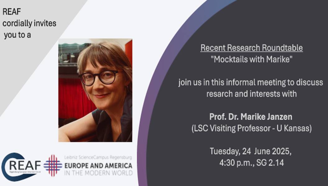 The Regensburg European American Forum (REAF), in cooperation with the Leibniz ScienceCampus, warmly invites you to a Recent Research Roundtable with LSC Visiting Professor Dr Marike Janzen from the University of Kansas. Join us on Tuesday, 24 June at 16:30 in S 2. 14 for an informal afternoon under the motto "Mocktails with Marike" – a relaxed opportunity to connect over refreshing summer drinks and engaging conversation about research, current projects, and shared interests.