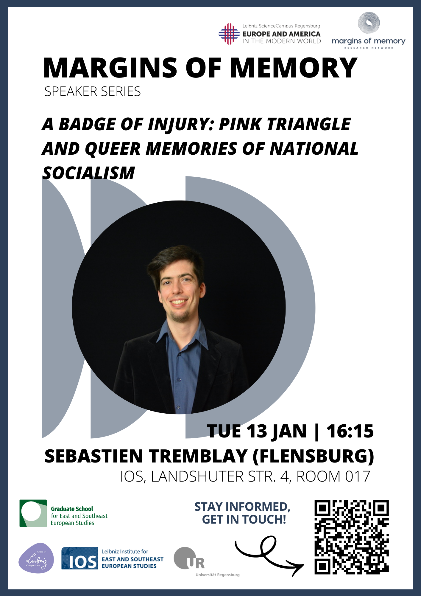 Abstract | In this talk, Dr. Sébastien Tremblay (Europa-Universität Flensburg) will explore the memory of the persecutions of queer individuals underNational Socialism. He will examine how symbols (circulated through printed media and displayed at protests) shaped a shared narrative of memory across the Euro-American world. The talk will address not only the successes of this collective remembrance andthe recognition of queerness as a key category within official, state-sanctioned memory of National Socialist crimes, but also the exclusions that have marginalized certain queer experiences in these debates. Drawing from his book A Badge of Injury (De Gruyter 2024), Dr. Tremblay will also emphasize the importance of provincializing queer history within and outside the Euro-American context and demonstrate the need to understand knowledge exchanges across languages from a transregional perspective.