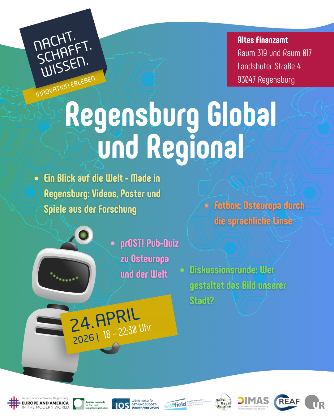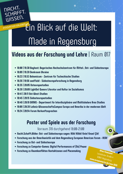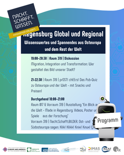 Im Rahmen des diesjährigen NACHT.SCHAFFT.WISSEN haben mehrere Einrichtungen der UR zusammen mit dem IOS Regensburg, in Partnerschaft mit der Stadt Regensburg, unter dem Motto „Regensburg Global und Regional – Wissenswertes und Spannendes aus Osteuropa und dem Rest der Welt“ einen Abend voller spannender Einblicke, Interaktionen und Spaß geplant. Kommen Sie mit uns hinter die Kulissen unserer Forschung und erhalten Sie einen Einblick in unsere Arbeit zur Wissensförderung über Osteuropa, Südosteuropa, das westliche Europa, die USA und die globale Welt. Bei dieser Gelegenheit möchten wir auch zusammen mit Ihnen darüber diskutieren, welche Auswirkungen die Umbrüche der globalen Ordnung, Migrationsbewegungen sowie wirtschaftliche, kulturelle und soziale Transformation auf das Leben in Regensburg und Deutschland haben.