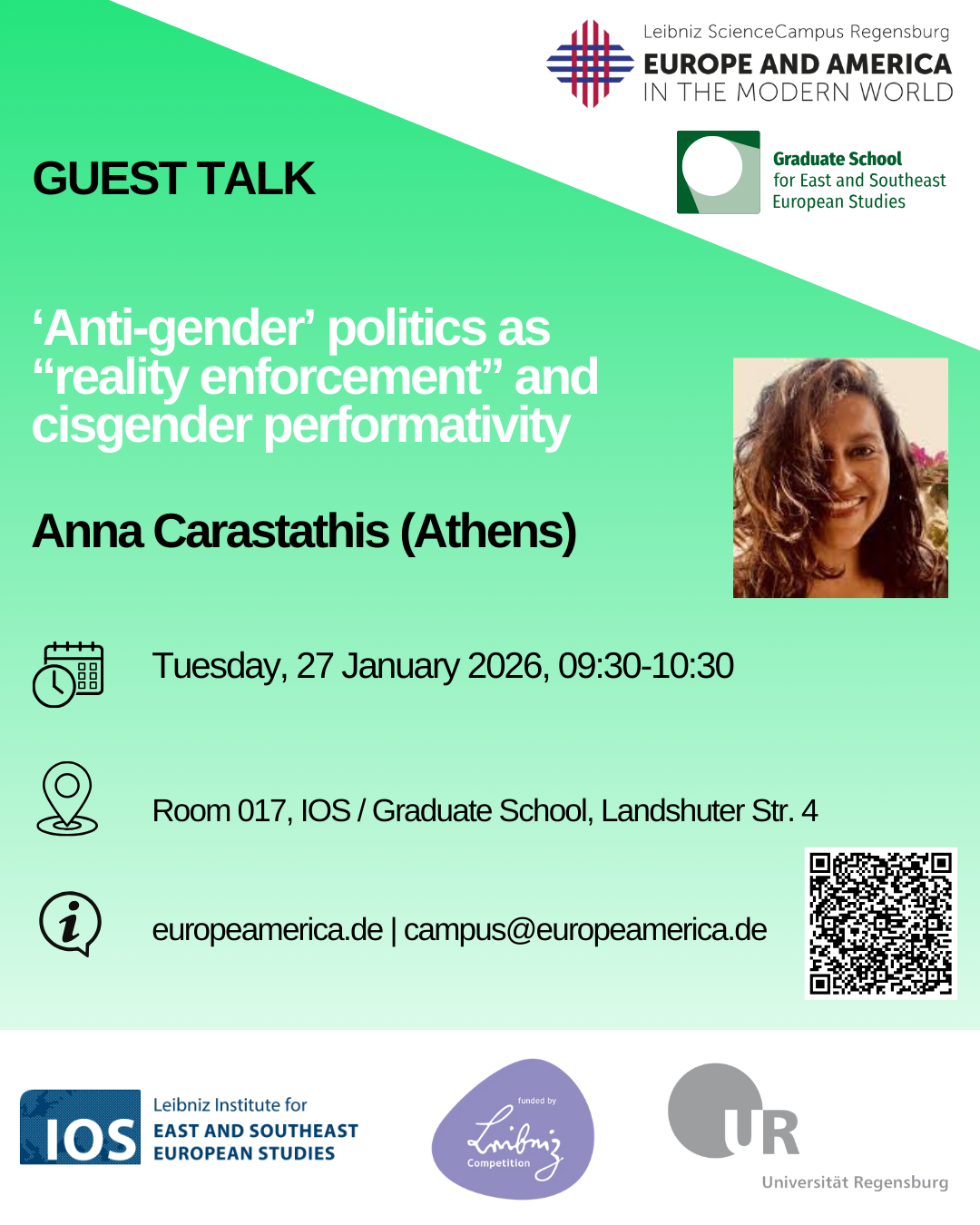 The Leibniz ScienceCampus, the Graduate School for East and Southeast European Studies, and Prof. Dr. Ger Duijzings are pleased to invite all colleagues and students to an open discussion and exchange with: Dr Anna Carastathis - a political theorist and co-director of the Athens-based Feminist Autonomous Centre for Research and senior researcher on the RESIST project: Fostering Queer Feminist Intersectional Resistances against Transnational Anti-Gender Politics. She is the author of Intersectionality: Origins, Contestations, Horizons (University of Nebraska Press, 2016) and co-author of Reproducing Refugees: Photographìa of a Crisis (Rowman & Littlefield International, 2020). She is also co supervisor of the LSC doctoral researcher Vita Zelenska.