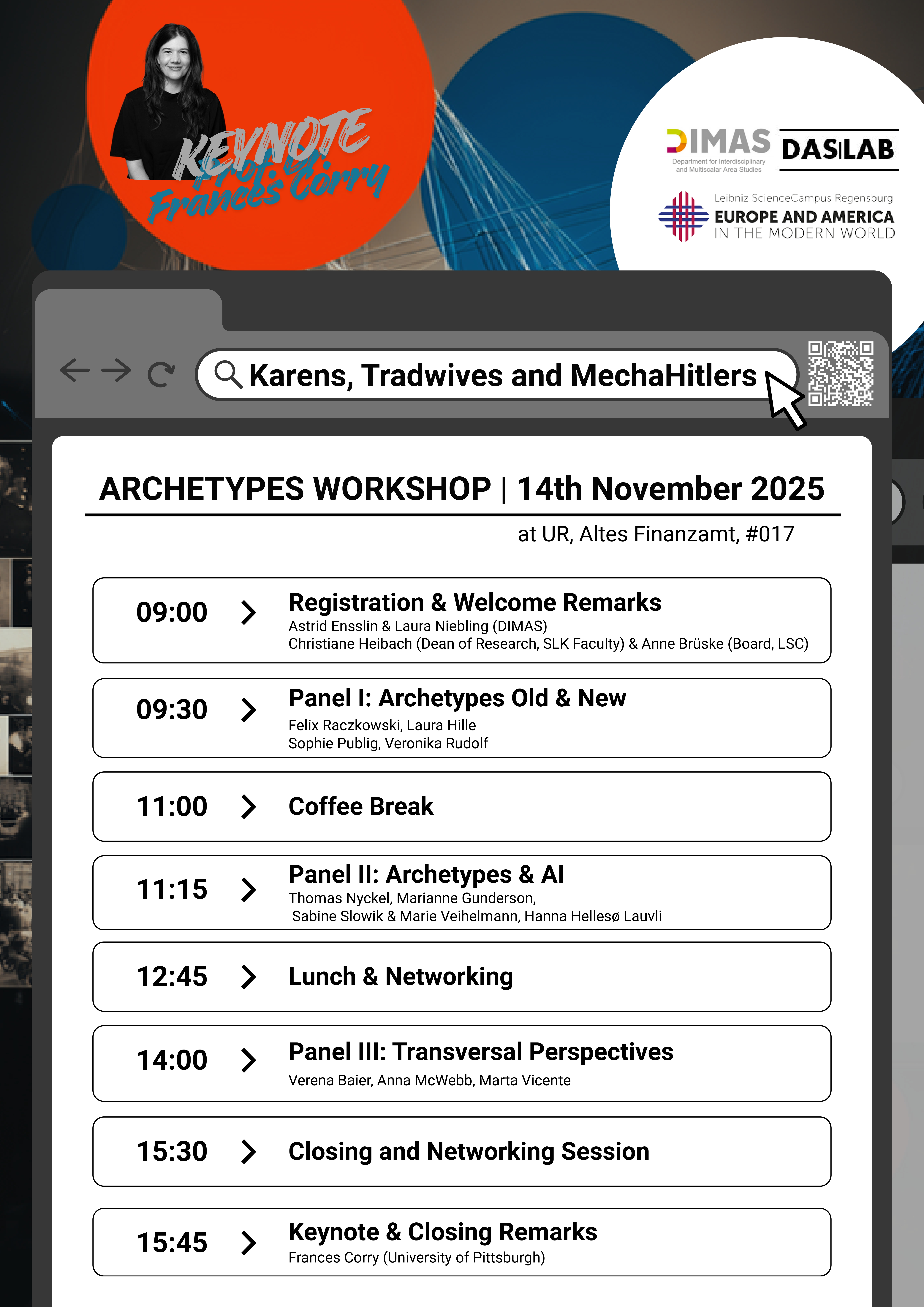 The one-day hybrid workshop is hosted at the Department for Interdisciplinary and Multiscalar Area Studies (DIMAS) at the University of Regensburg by Astrid Ensslin and Laura Niebling. Generously funded by the Leibniz ScienceCampus Regensburg, it will bring together perspectives from various transatlantic, European and North American academic communities, among them the US, Canada and Norway, on the topic of Internet archetypes and post-digital storytelling. Using a case study approach, we will critically engage with the idea of the Web as a new “collective unconscious” , and revisit and question Jung’s and other, emergent archetype schemata in light of how they might reflect elements of contemporary post-digital imaginaries and transcultural flows within the imagined “Global North” .